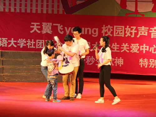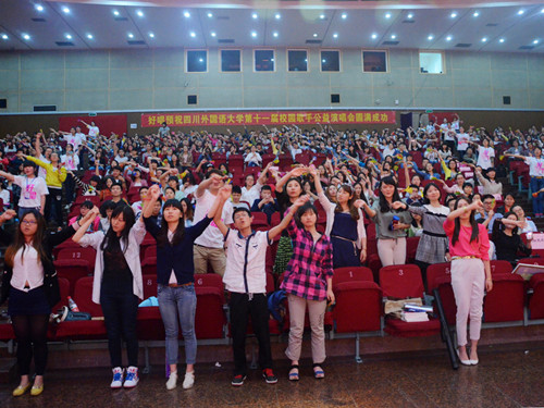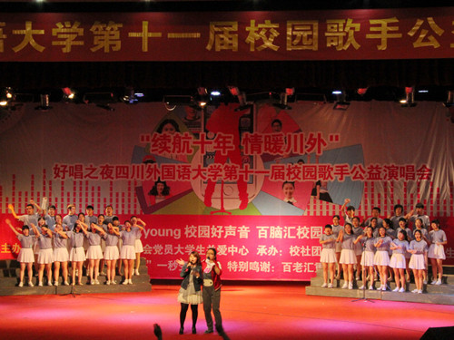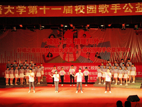 5月9日晚,由四川外国语大学社团联合会党员大学生关爱中心主办,川外校社联、学生会、大学生艺术团承办的“续航十年,情满川外!四川外国语大学第11届校园歌手公益演唱会”在川外东区大礼堂温暖开幕。本次公益演唱会邀请到优秀校园歌手、教师代表和优秀校友代表,并得到重庆米虫科技“好唱—秒变歌神”、百脑汇、中信银行等善心企业大力支持。校园歌手们倾情表演、播散爱心,努力为川外两名身患重病的花季少女募集医药费,也鼓励更多学子珍惜时光、心存感念。