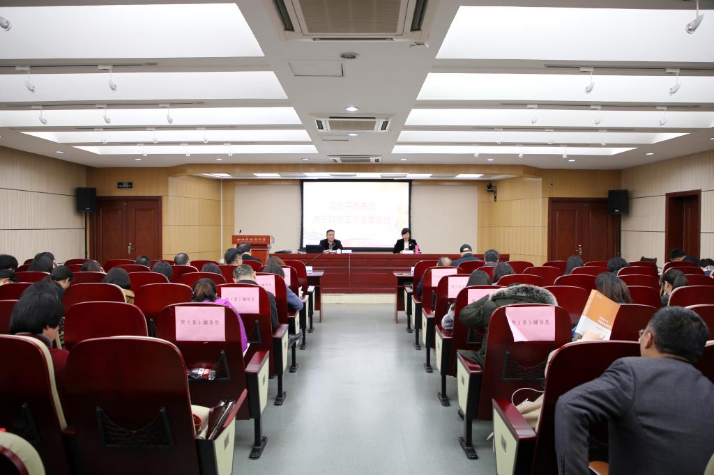 3月6日下午,学校在西区办公楼A609召开学习贯彻习近平总书记关于扶贫工作会议重要论述宣讲会。市委宣讲团成员、市委党校经济学教研部副主任、教授孙凌宇担任主讲,全体校领导、党委理论学习中心组成员、院系党总书记及辅导员参加宣讲会。宣讲会由党委副书记张艳主持。