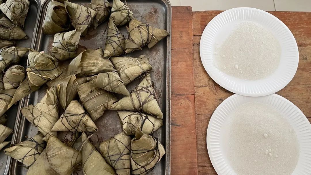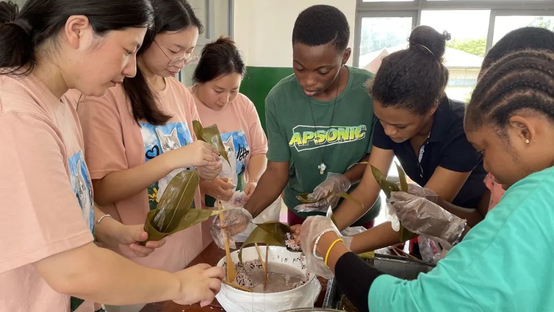 孔院老师为学生们示范了如何包粽子。老师们娴熟地把一片片墨绿的粽叶叠成漏斗的形状,放入糯米、红豆、黑米和大枣,再用绳子扎紧后放入锅中蒸煮。粽叶散发出清雅的淡香,出锅的粽子个个色泽鲜亮,学生们品尝后都对这一口味独特的中华传统美食称赞不已。