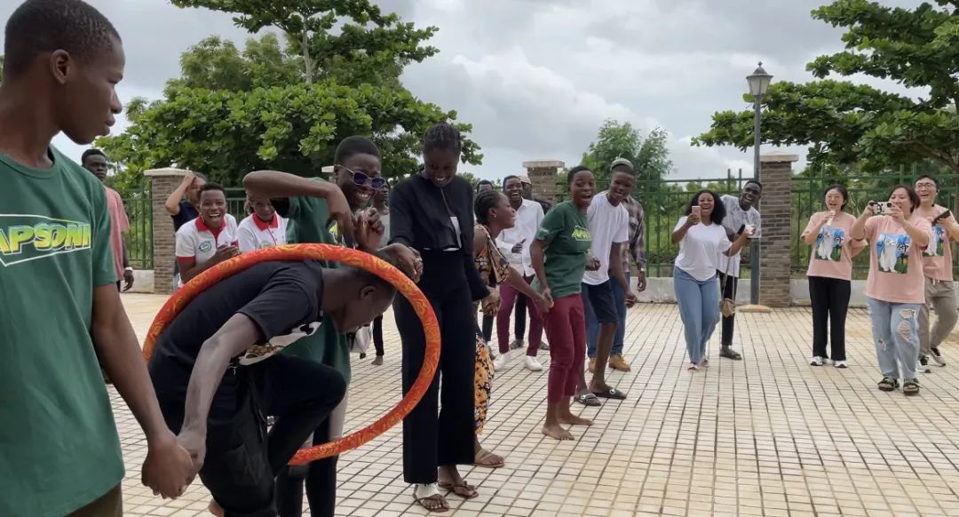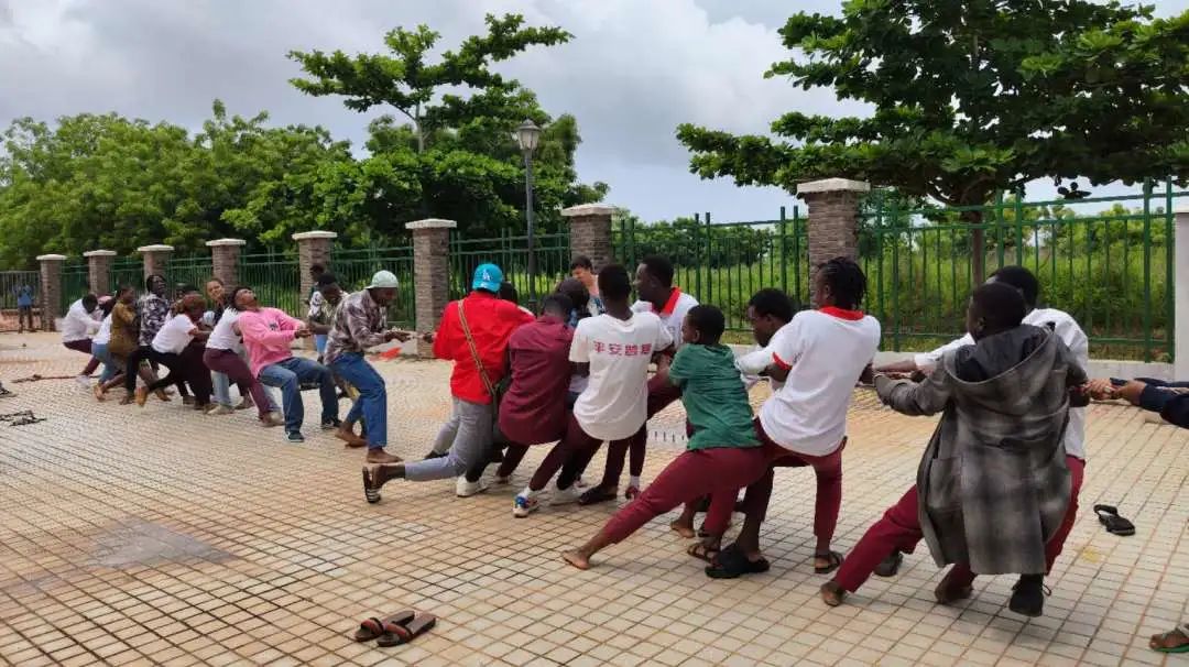 随后,孔院老师还组织学生们参与拔河、跳长绳、踢毽子、“一圈到底”等趣味活动。兴趣班一、二年级和中文专业的学生们进行了一场激烈的拔河比赛,现场助阵呐喊声此起彼伏,同学们热情高涨,共同体验趣味运动的乐趣。