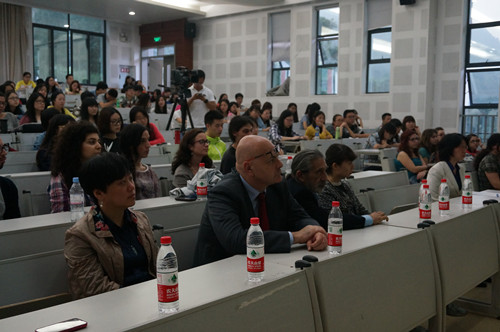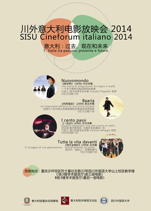5月19日到27日,为期两周的“川外意大利电影放映会”如期举行。放映会以“意大利:过去、现在和将来”为主题,通过四部影片的放映,展现意大利从20世纪初到当今的社会变迁。此次活动由我校与意大利驻重庆总领事馆、意大利驻华大使馆文化处共同举办。意大利领事馆总领事马非同先生(sergio maffettone)、李克勇校长、总领事馆随员德拉萨拉先生(robert della sala)以及法语系尹丽主任出席了5月26日的特别放映会。本次活动由法语系意大利语专业负责人杨琳老师主持。重庆电视台录制了此次活动。