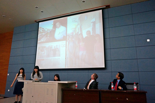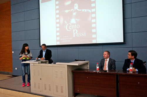 本次电影会放映的四部电影分别是:介绍20世纪初期意大利赴美移民故事的《新世界》,描绘意大利西西里岛前世今生的《巴阿里亚》,反映芭比诺·因巴斯塔托与黑手党抗争一生的《一百步》以及反映意大利年轻人严峻就业形势的《明天会更好》。电影放映前后,分别由意大利语专业外教claudia filippello老师与lorenzo miraglia老师做讲解并回答提问。意大利语专业大三的杨斐同学与何雪同学为活动做了精彩的口译。值得一提的是,意大利语专业大四的刘陈足嘉同学与大三的陈方姝同学,去年暑假在意大利巴勒莫大学外国人意大利语学校参加summer school项目时,曾有幸见到了芭比诺·因巴斯塔托(peppino impastato)(电影《一百步》的主人公原型)的兄弟——乔万尼·因巴斯塔托(giovanni impastato)。两位同学以流畅的语言和优美的叙述与大家分享了在意大利的文化体验和人生感悟,表达了她们对于芭比诺英雄行为的崇敬之情。