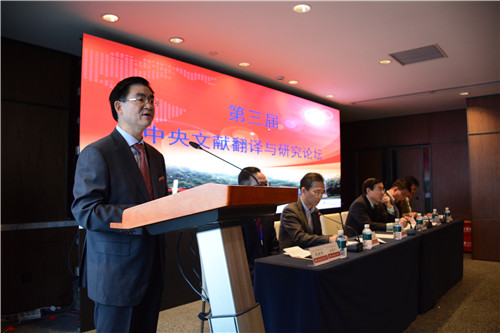 黄友义做题为《党政文献翻译与构建中国国际话语权》的大会主旨发言。他阐述了党政文献翻译在构建中国国际话语权、创新中国话语传播体系等方面所扮演的重要作用。他强调,中央文献翻译的紧迫性与日俱增,怎样把中国理念、道路、方案以及中国未来发展的解说权牢牢掌握在自己手中,至关重要。他认为,应当针对不同国家、不同文化,讲好“一带一路”故事,让中国的对外传播变得“更接国际地气”。“我们要做的就是通过准确的翻译在中西方两种文化之间架设沟通的桥梁,不仅是翻译成对方能看懂的文字,更重要的是把字里行间的‘精神’用目标语言展现出来”。