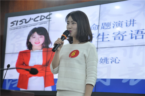 在主题演讲环节,选手们根据抽取的题目发表不同形式的主题演讲。5号选手张琦以一首小诗点睛——“春水初生,春林初盛,春风十里,不如你”作为新生寄语来表达自己对学生和本职的热爱。