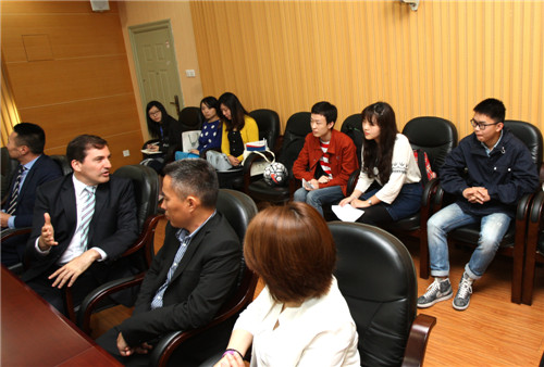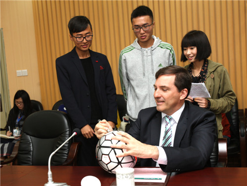 会谈后,费尔南多·卢格里斯大使一行友好地与西班牙语系师生以足球为话题进行交流。大使对我校学生流利的西班牙语表示高度赞赏,希望两国加强足球方面的合作。随后,大使在西班牙语系学生准备的足球上签名。