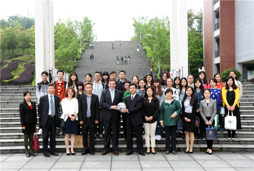 乌拉圭共和国驻华大使馆中方雇员张琪,力帆集团乌拉圭公司副总经理刘晋,力帆集团国际贸易部常务副部长谢皆霞,我校