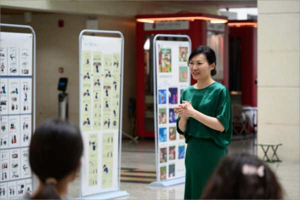紧接着,邓晓梅上台发言。她代表国际法学与社会学院向歌乐艺术中心和图书馆表示感谢。她提到,非常感谢歌乐艺术中心为国际法学与社会学院的师生们提供了充分展现才华才能的机会,也为学院提供了在校内宣传办学成果的平台,同时也感谢图书馆为此次画展提供场地支持。接着,她从新文科理念背景下学科专业融合发展和复合应用型人才培养的角度阐述了此次画展的意义。国际法学与社会学院一直高度重视专业人才培养中的多学科知识和技能的复合融通。此次画展中相当大一部分作品为社会工作专业师生创作,利用原创数码动画作品传播倡导社会工作理念与知识也是肖彦老师一直耕耘的领域,其创作的作品和打造的新媒体平台在国内具有广泛影响力,肖彦老师将艺术学、传播学与社会工作相互融合的实践探索也得到了学界的广泛认可。在肖老师的引领和指导下,学院已有多名同学走上CG创作之路,既激发了更多潜能,也获得了自我成长。因此,此次画展既是培养学生全面发展的重要途径,也是学院新文科办学成果的充分展现。最后,她提出希望以此次合作为起点,在未来与歌乐艺术中心进一步加强合作,将CG画展打造为学校美育的一张靓丽名片。