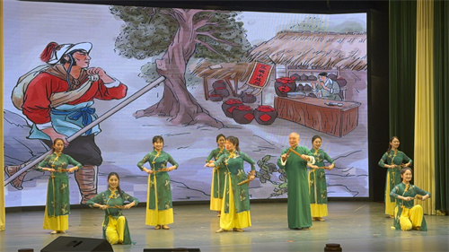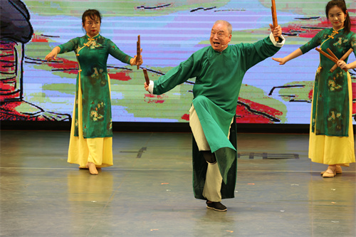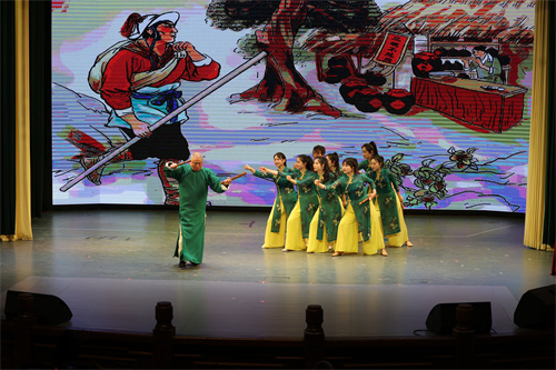 备受瞩目的是来自四川外国语大学非物质文化遗产推广基地的金钱板表演队,作为唯一一所受邀的高校代表,四川外国语大学派出了由国家一级演员、国家级非物质文化遗产代表性传承人丁长福老先生和8名川外师生参与此次展演。他们带来的金钱板《武松打虎》(上本)表演,不仅展现了中华优秀传统文化的独特魅力,更让观众身临其境。生动的说唱、流畅的表演让现场观众如痴如醉,不时爆发出阵阵热烈的掌声和喝彩声。