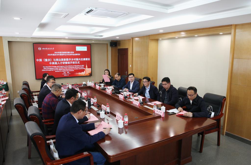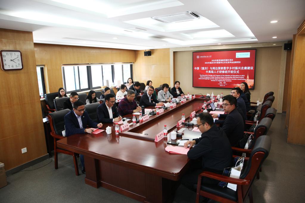 北京时间2023年4月10日16:00,“中国(重庆)与周边国家数字乡村振兴走廊建设中高级人才研修班”在我校立德楼会议室,连线斯里兰卡、巴基斯坦、老挝、乌兹别克斯坦四国正式举行开班仪式。四川外国语大学国际合作与交流处处长张幼斌、发展中国家振兴组织秘书长LIU YANG SLOAN联合主持,重庆市委外事工作委员会办公室秘书处处长冯仁勇等7名政府领导干部,四川外国语大学党委常委副校长卢波等9名高校专家学者,以及来自斯里兰卡、老挝、巴基斯坦、乌兹别克斯坦的13名外方代表及100余名学员共同参与了本次开班仪式。