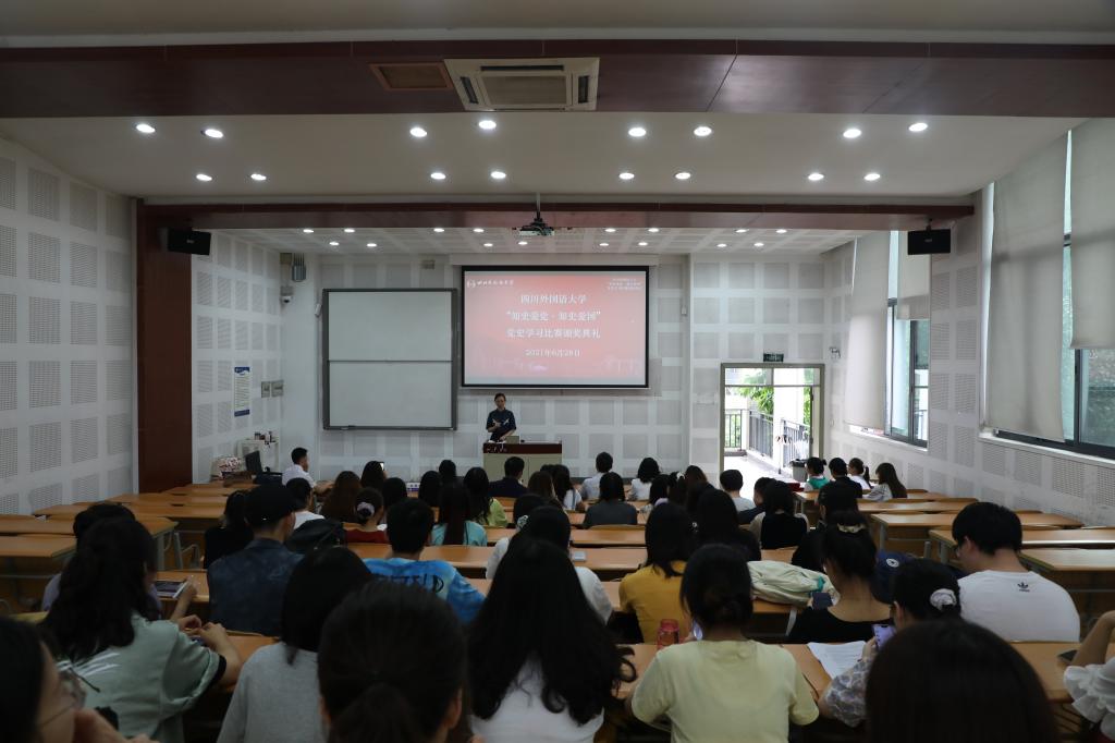 6月28日,“知史爱党•知史爱国”党史学习比赛颁奖仪式在歌乐楼C2-2成功举行。四川外国语大学党委宣传部副部长宋雷、校团委书记陈派、马克思主义学院副院长王正宇以及马克思主义学院朱玲、黄馨、曾利等老师出席,颁奖仪式由陈黎黎老师主持。