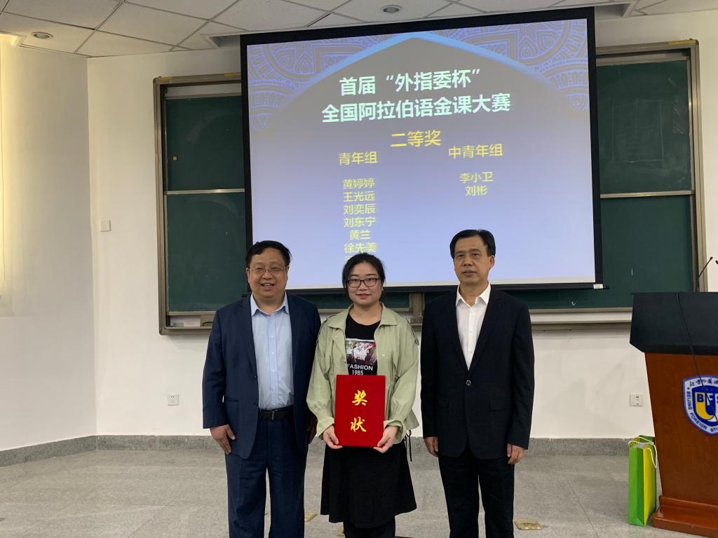 首届“外指委杯”全国阿拉伯语金课大赛由教育部高等学校外国语言文学类专业教学指导委员会阿拉伯语分委员会主办,北京外国语大学阿拉伯学院、外语教学与研究出版社共同承办,来自全国数十所高校阿语专业的中青年教师参加了此次大赛。大赛1月份启动,分为青年组及中青年组,历经初赛、半决赛教学设计、演示文稿与授课视频等环节的层层筛选,最终17位教师脱颖而出,进入总决赛。5月6日,金课大赛总决赛举行,参赛教师现场进行10分钟的阿语说课以及3分钟的评审专家问答。黄婷婷老师首发出场,以其流利的阿语、清晰的逻辑、自信的笑容赢得评审专家的一致认可,最终斩获大赛二等奖,展现了我校青年教师的风采。