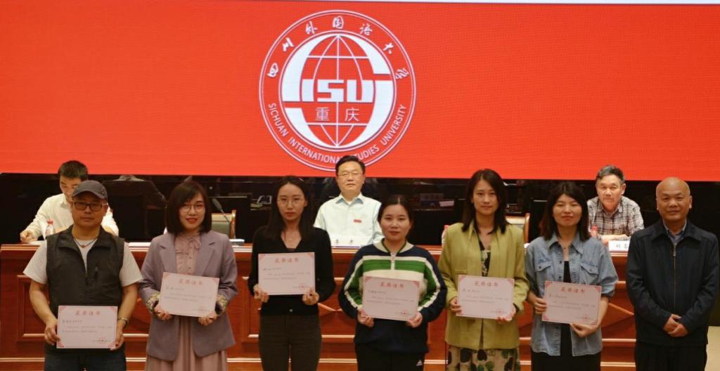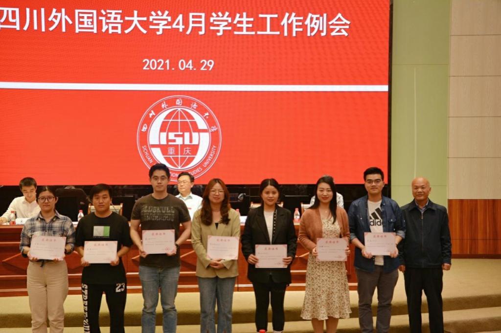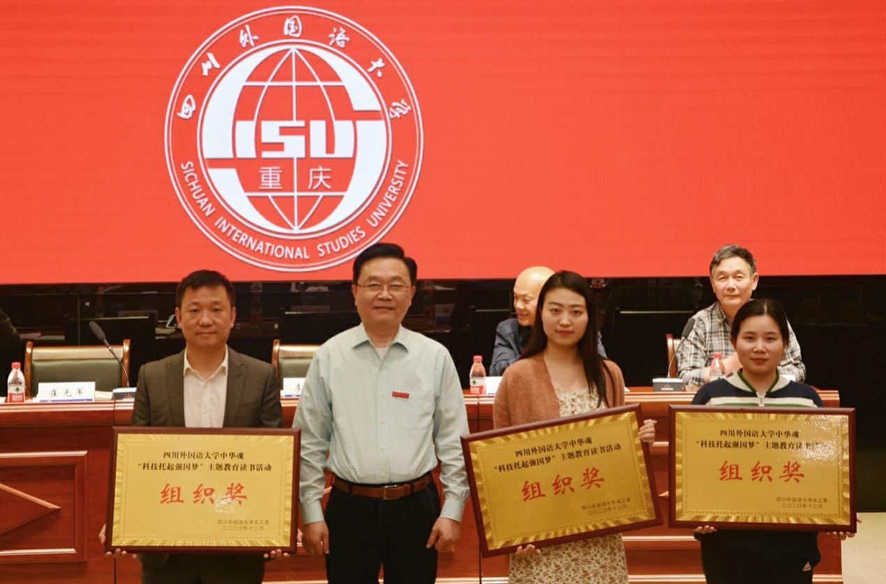 崔光军宣读《四川外国语大学2020年中华魂“科技托起强国梦”主题教育读书活动暨征文、演讲比赛获奖通报》。聂志强、李彦分别为获奖的学院和教师颁奖。