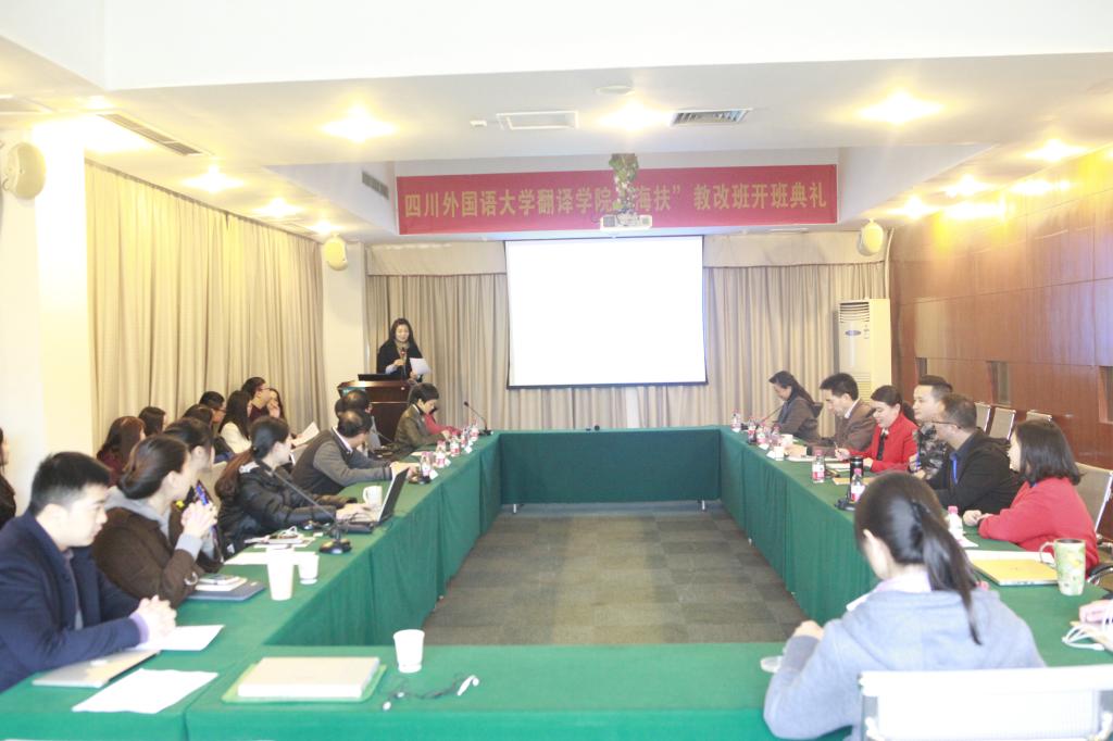开班典礼上翻译学院主管研究生教学的朱海燕老师向与会者介绍了海扶班的班级构成、班级设置目的以及课程设置等方面。她重点介绍班级的设置目的,即培养复合型、应用型的跨文化交际人才。她讲到,随着社会经济的飞速发展,单一语言的翻译人才已远远不足以满足社会的多元需求,我们必须突破传统的人才培养模式,创新培养机制,努力培养复合型应用人才,以满足社会需求。朱海燕认为,“富于巧技,方能立足天地”。
