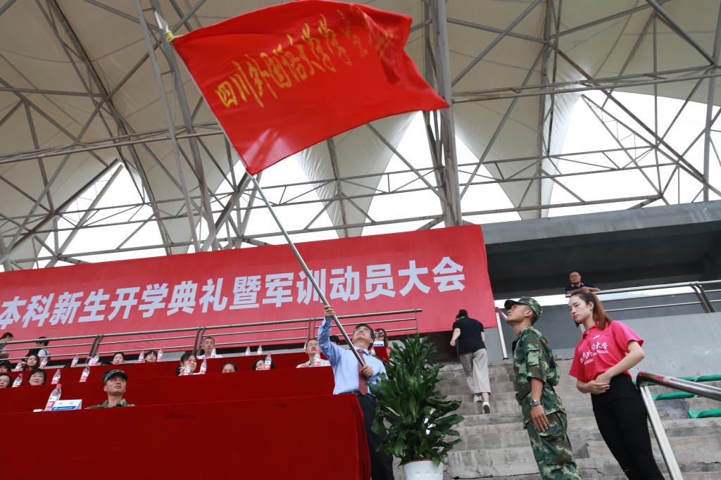 举行“四川外国语大学学生军训团”团旗授旗仪式后,会场奏响四川外国语大学校歌。