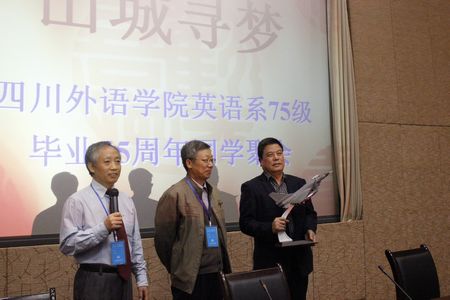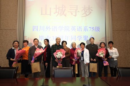 10月18日上午9点,2013年“山城寻梦”英语系75级同学会在宏文楼国际报告厅举行。校党委书记马新发,校友总会会长张洪良,副校长李建平,英语学院院长张旭春,恩师代表和60余位来自祖国各地以及美国、加拿大、法国、澳大利亚等国的75级校友参加了同学会。会议由75级校友郑双印同志主持。此次同学会旨在山城寻梦,回归母校,重温青春,共创美好未来。