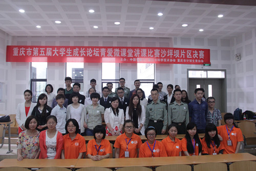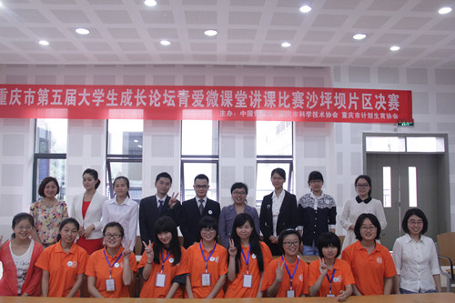 2014年5月9日下午,重庆市第五届大学生成长论坛青爱微课堂讲课比赛沙坪坝片区赛在我校西区教学楼c1-2拉开帷幕。本次大赛由中国青爱办、重庆科学技术协会、重庆市计划生育协会主办,重庆市青少年性健康教育研究会、中国青爱工程重庆市基地、重庆市社会心理学会和四川外国语大学联合承办。大赛邀请到了第三军医大学心理教员刘波涛、重庆工商大学融智学院心理咨询中心主任的杨惠琳和四川外国语大学应用外语学院党总支副书记李冬青老师担任评委。比赛开始,四川外国语大学学生处副处长古晶致辞,对来自各院校的参赛的选手们表示热烈的欢迎,并期待选手们今天的精彩表现。