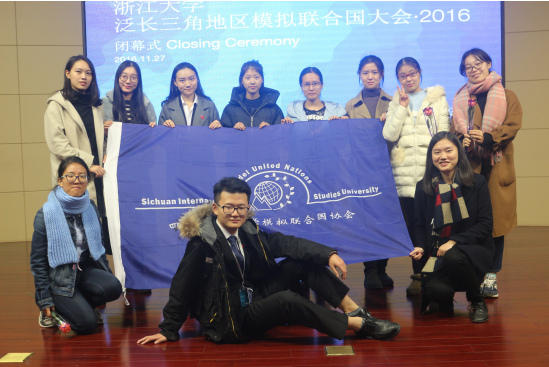 2016年11月24日至11月27日,中国“泛长三角地区模拟联合国大会•2016”(Zhejiang University Pan-Yangtze River Delta Model United Nations Conference•2016)于浙江大学紫金港校区成功举行。大会共设置4个英文委员会、2个中文委员会以及各媒体中心,吸引了来自全国各所大学的优秀青年代表参加。我校模拟联合国协会派出9名参会代表参加此次会议,共获得7个个人奖项和一个团体最高奖,受到其它学校和代表团的称赞。