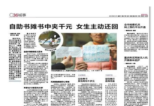 3月15日,《重庆商报》报道此事,引起了大家对诚信的热议以及对川外学子的广泛赞赏。原文链接: