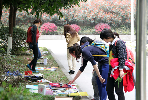 其实,只要留心观察便可发现,川外的诚信之花早已开遍校园。教学楼里,常有同学将捡到的雨伞交到大学生自律委员会,该组织专门成立了“失物招领”部门,处理同学们在教室捡到的物品。“失招部”所属的“伞下晴空”公益借伞服务平台从2011年11月成立以来方便了众多同学,雨天去大自委借伞已成为一种习惯,同学们的及时归还也让这种诚信文化流传了下去。在学校论坛、学生组织的官方微博上,也设有失物招领的平台。记者了解到,同学们的饭卡、书籍、钱包等随身物品大多都能物归原主。如今,运用这一平台找物寻物的师生越来越多,丢了东西、捡到东西就去微博、论坛上吼一吼也成了大家约定俗成的模式。