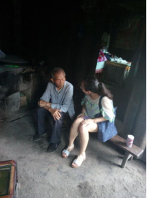 她的养父已是83岁高龄,早已经扶着门框,站在在门口迎接我们。垮得仅剩一小半的破旧的土墙木屋瓦房,在风雨中看着十分的危险。