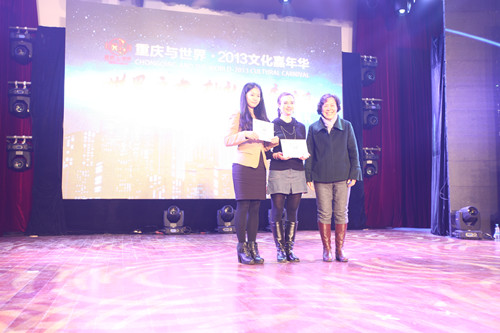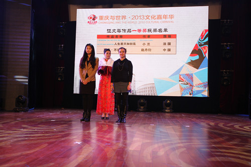 颁奖典礼上,我校选送的作品从众多参赛作品中脱颖而出,一举囊括征文类两个一等奖。法国籍教师ellénore loehr(中文名:小兰)的《人生若只如初见》荣获外籍人士组一等奖;我校英语学院10级学生赵丹衍的《重庆·不说再见》荣获市民组一等奖。