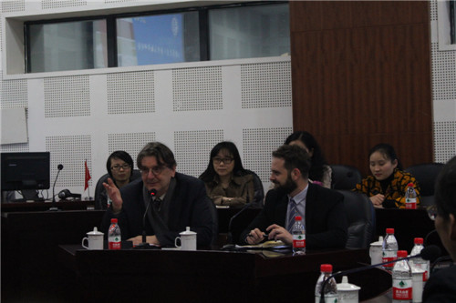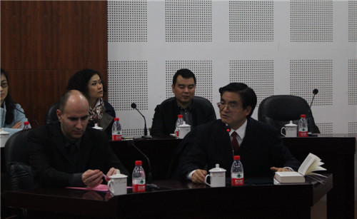 2015年11月24日下午,“《领事先生》创作与翻译” 研讨会在我校西区教学楼模拟联合国教室举行。研讨会由李克勇校长和法国驻成都领事馆总领事魏雅树共同主持。3位主讲嘉宾分别为lucien bobard的遗孀 anne-