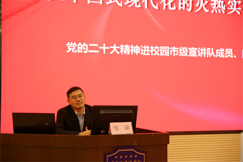 邹渝在报告中说,党的二十大是在全党全国各族人民迈上全面建设社会主义现代化国家新征程、向第二个百年奋斗目标进军的关键时刻召开的一次十分重要的大会,具有十分重大的政治意义、理论意义、战略意义、实践意义。党的二十大报告深入总结我们党坚持和发展马克思主义的历史经验,系统阐述“两个结合”的要求,精辟概括习近平新时代中国特色社会主义思想贯穿的立场观点方法,号召全党继续推进实践基础上的理论创新,不断开辟马克思主义中国化时代化新境界。习近平新时代中国特色社会主义思想是坚定自觉坚持和发展马克思主义的典范,是坚持“两个结合”、勇于推进理论创新的产物,以全新的视野深化了对共产党执政规律、社会主义建设规律、人类社会发展规律的认识,实现了马克思主义中国化时代化新的飞跃。