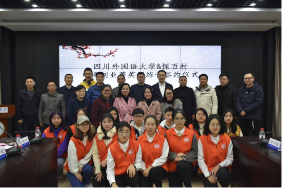 2019年12月13日上午,四川外国语大学与探百村电商创业菁英训练营签约仪式在我校行政楼如约举行。校党委书记邹渝,万州区白羊镇纪委书记、大悟村联村领导幸永鸿,白羊镇组织委员罗绍成和涪陵电商公司总裁杨春光等出席会议。