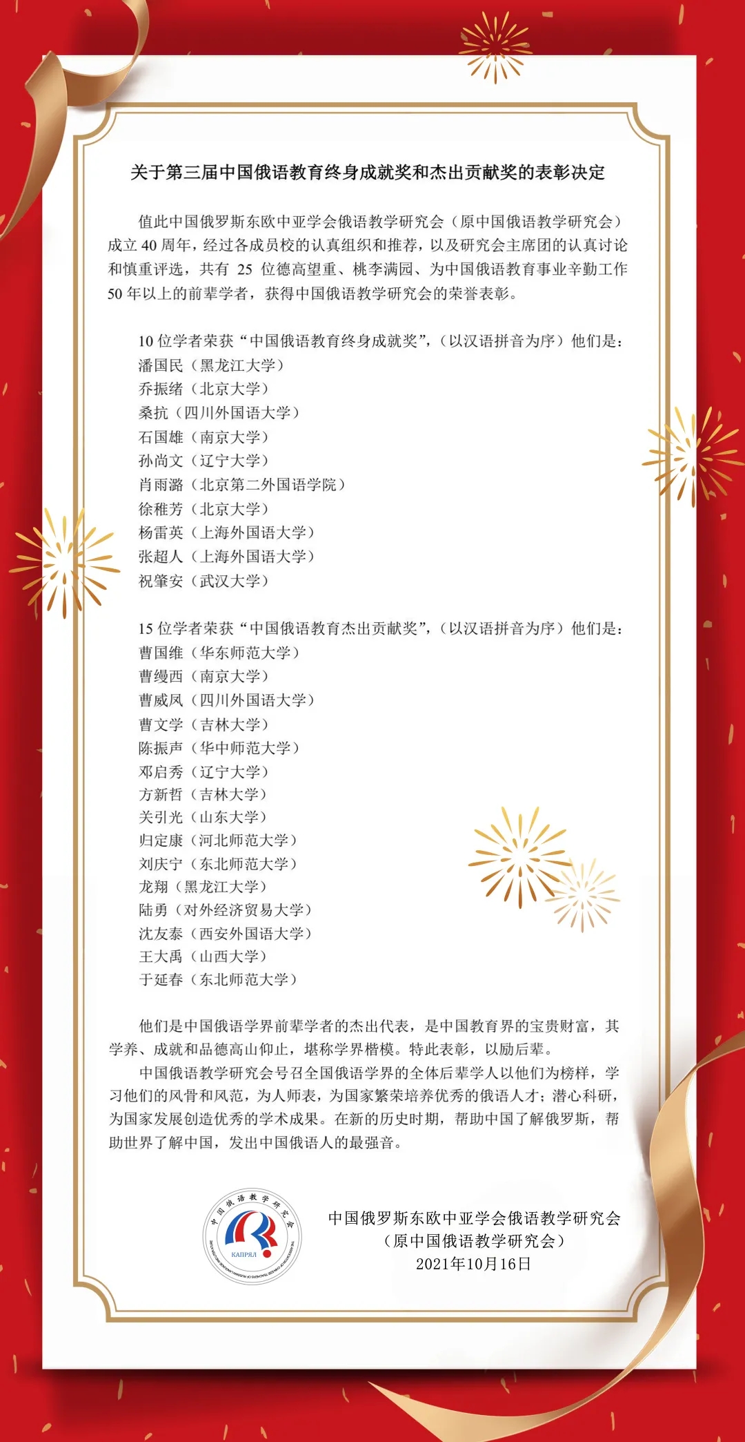 2021年10月16日中国俄罗斯东欧中亚学会俄语教学研究会成立40周年纪念大会在上海外国语大学召开,本次大会颁发了第三届中国俄语教育终身成就奖和杰出贡献奖,共有来自全国17所高校的25名德高望重、为中国俄语教育事业辛勤耕耘50年以上的学者获得表彰,其中,我校俄语学院2位老教师——桑抗教授荣获“中国俄语教育终身成就奖”,曹威凤教授荣获“中国俄语教育杰出贡献奖”。