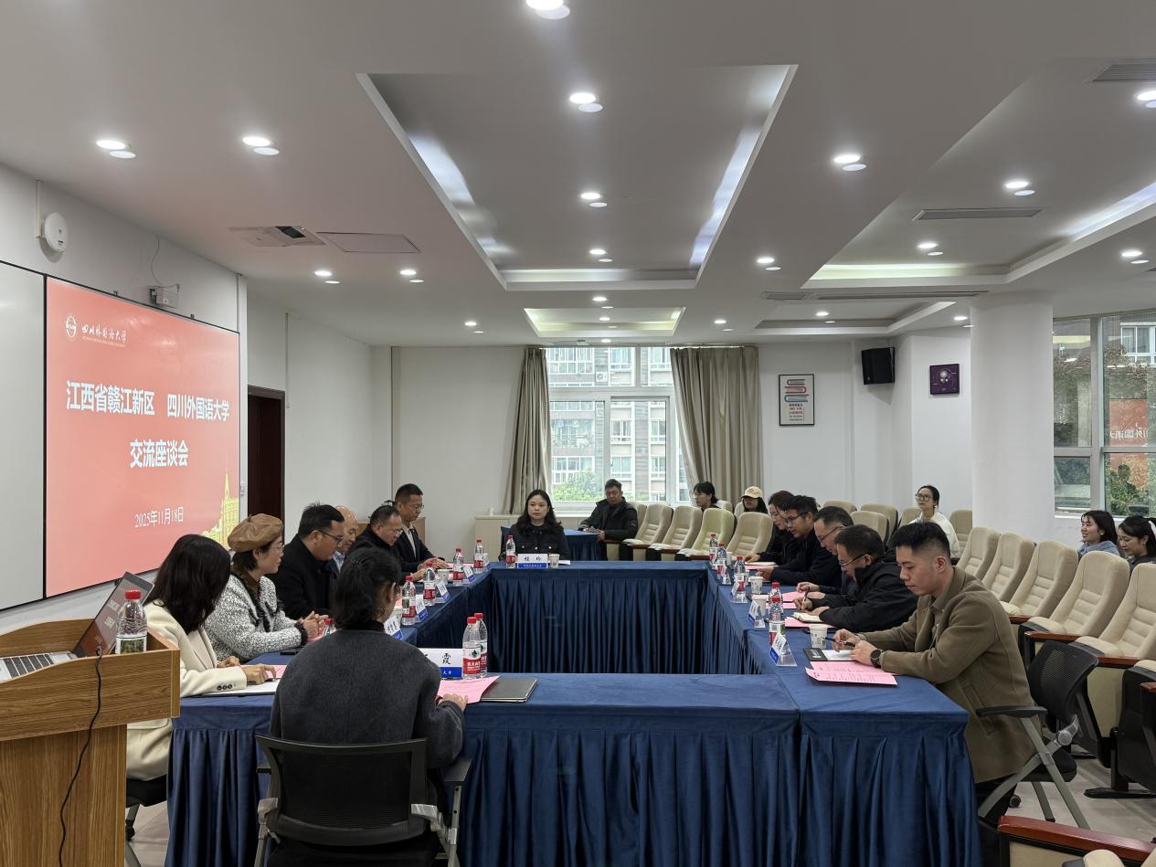 王仁强代表学校对许斌副主任一行表示欢迎。他指出,川外始终以服务国家战略为导向,在全国高校中率先成立语言智能学院,系统布局语言脑机接口、智慧语言康复等前沿方向,积极探索语言学与脑科学、人工智能、临床医学的交叉融合。他强调,学校已在包括量子语言学等新兴领域开展理论探索,致力于以科技赋能语言,推动学术创新向民生应用转化。他表示,赣江新区在生命健康、智能制造等产业领域的前瞻布局与川外的学科发展方向高度契合,希望双方以此次交流为起点,围绕平台共建、成果转化、人才共育以及产业发展等方面深化合作,共同破解“从实验室到市场”的转化难题。