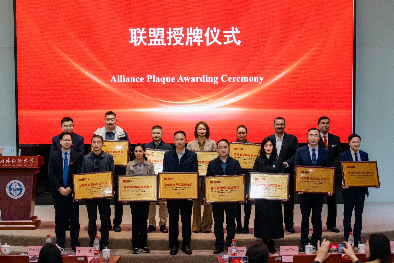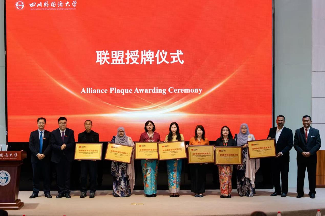 会上举行了联盟新成员授牌仪式,董洪川和马来西亚与泰国教育代表共同为新加入的18个联盟单位授予四川外国语大学“基础教育国际联盟”单位称号。