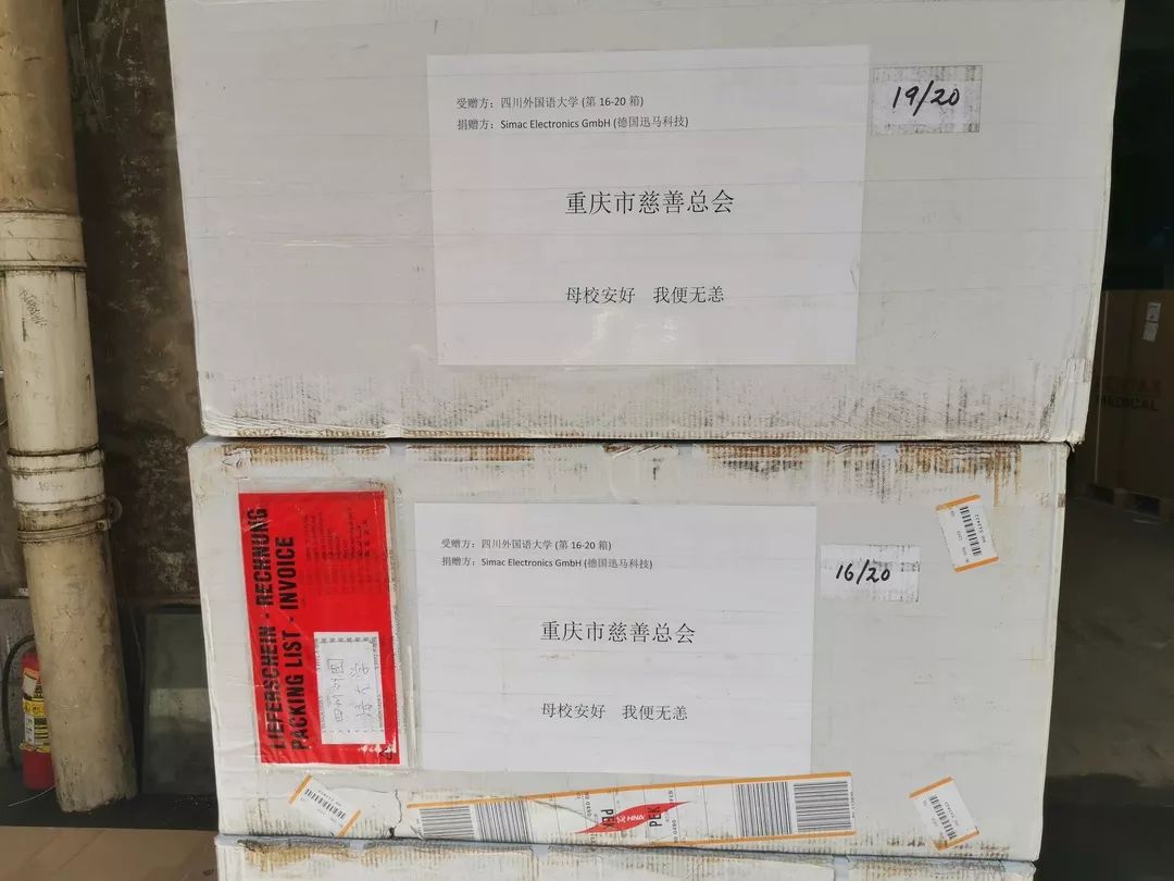 2月15日,五箱贴着“母校安好,我便无恙”的捐赠物资由重庆市慈善总会转发到我校,里面装的1000只FFP2口罩,来自我校德语系86级校友、德国华人企业家杨悦的捐赠。