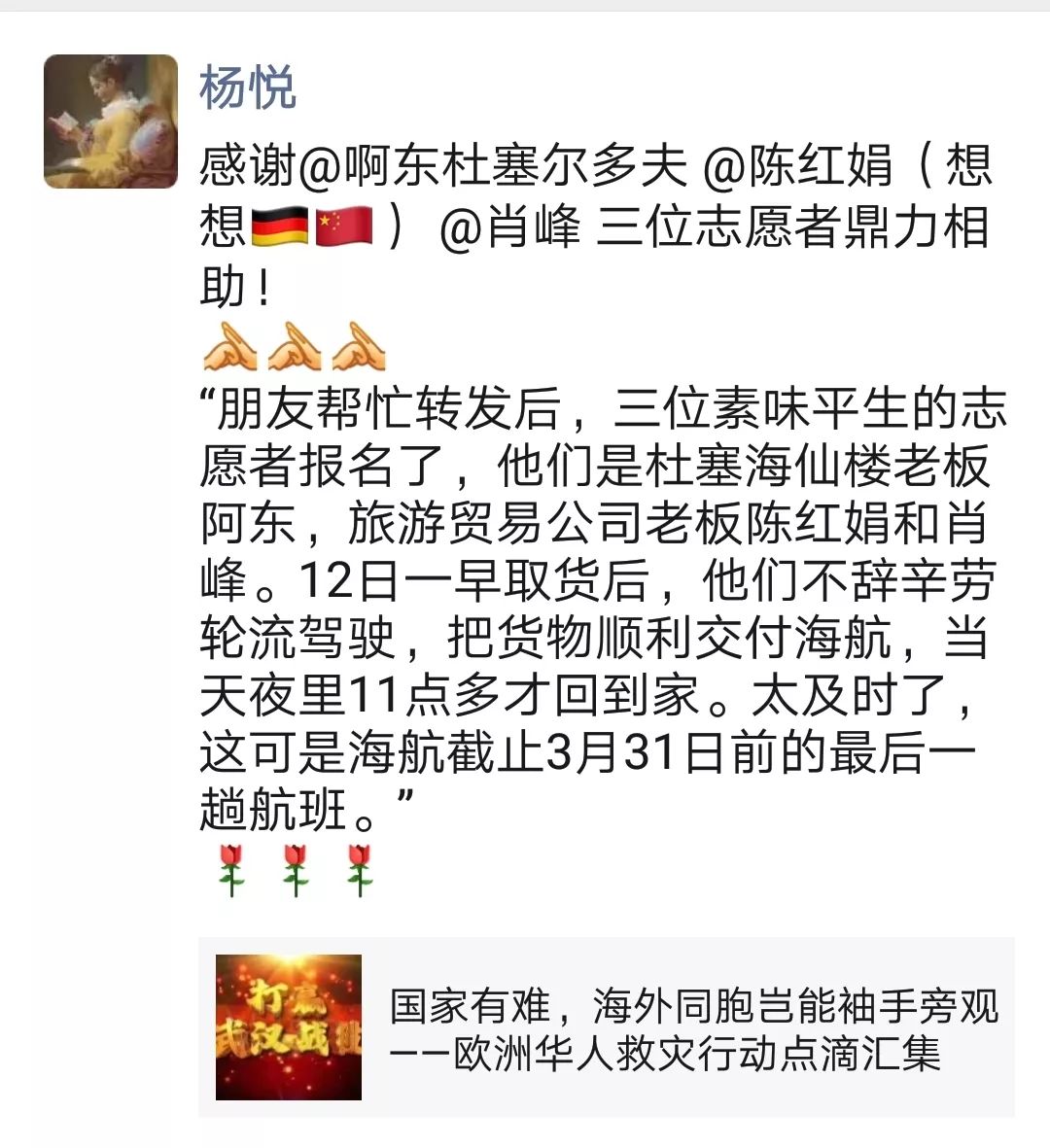 杨悦夫妇捐赠的消息在德国华人圈不胫而走,朋友们与陌生人纷纷向她打听捐赠与运输的相关事宜,她不厌其烦地一一回复、解释、沟通并牵桥搭线。杨悦说:“德国邮政和快递公司都纷纷暂时停运中国了,附近的杜塞国航和阿姆斯特丹东航下周也将停航,订货和运输越来越困难,但大家还是会继续努力的。”