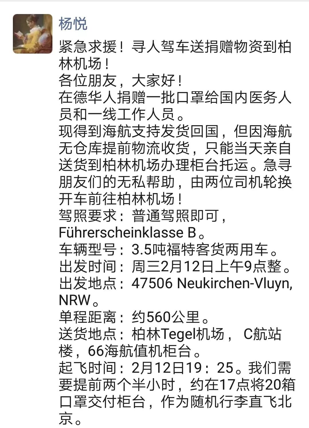 “在德国的朋友,大家好!有没有最近回国的旅行团,愿意帮忙携带德国华人捐赠的医用口罩FFP2到重庆?医院急需。240个一整箱。这样节省时间,免去节外生枝。请有可能提供帮助的朋友尽快联系我!”2月初开始,一条求助信息开始在德国华人微信群、朋友圈流传。为了尽快地把货物运到国内,一向低调的杨悦通过微信群聊和朋友圈广泛求援。