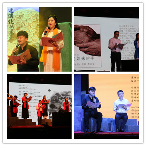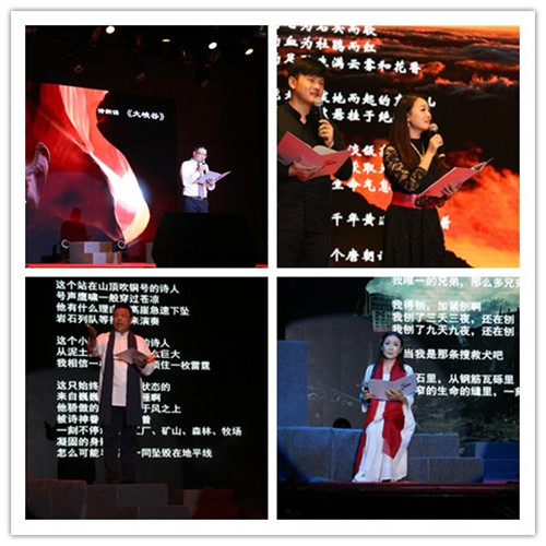 “花甲花甲,就是开甲等的花。花开在春天,你在起点。”朗诵会进入第三篇章,音乐的节奏加快,从悲壮低沉变得明快起来。希望的色彩,在每首诗里融化。女生独唱《轻轻推开一扇窗》把晚会推向最后的高潮,深情地演唱后是长久而热烈的掌声。