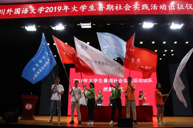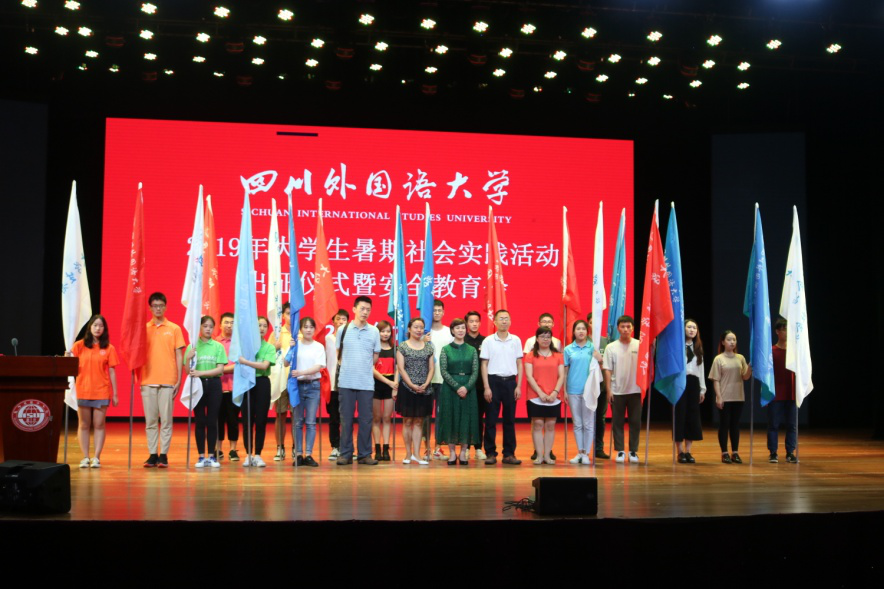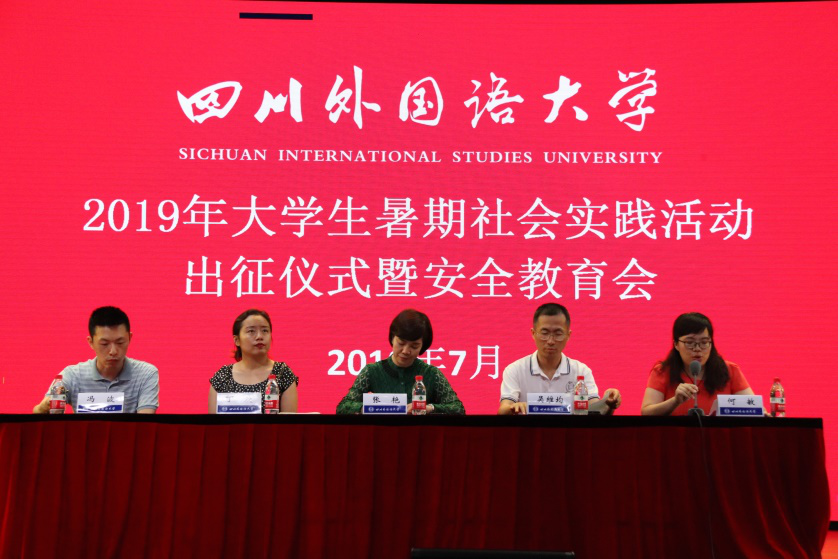 7月8日晚19:00,四川外国语大学2019年大学生暑期社会实践活动出征仪式暨安全教育会于东区大礼堂举行。校党委副书记张艳,学生处处长吴维均,校团委书记丁欢,校团委副书记冯波出席本次仪式。到场的还有全体实习领队老师以及参加暑期实践活动的学生,活动由学生处副处长何敏主持。