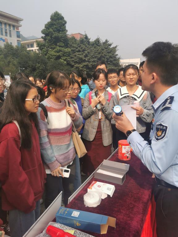 在消防器材展台前,教官耐心地解答师生们提出的各种消防安全问题,向他们介绍防护类、逃生类消防器材的使用方法。