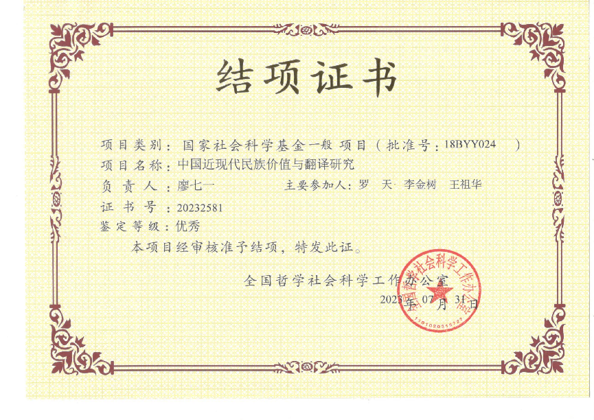 近日,接全国哲学社会科学工作办公室通知,我校廖七一教授主持完成的2018年度国家社科基金项目《中国近现代民族价值与翻译研究》(课题批准号:18BYY024),于7月份顺利通过鉴定结项审批,成果鉴定等级为“优秀”(证书号:20232581)。
