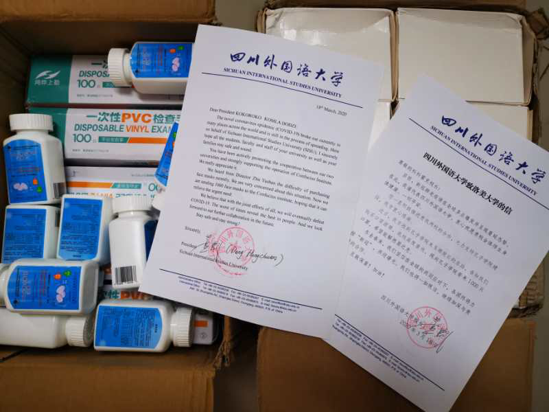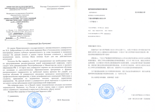 学校积极筹措防疫物资,第一时间组织向下诺夫哥罗德国立语言大学寄送1000只口罩,向洛美大学寄送1000只口罩、1000副手套和20瓶消毒片剂,随同寄送的还有校长董洪川的慰问信。