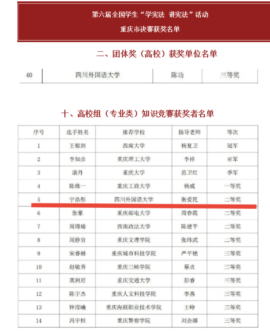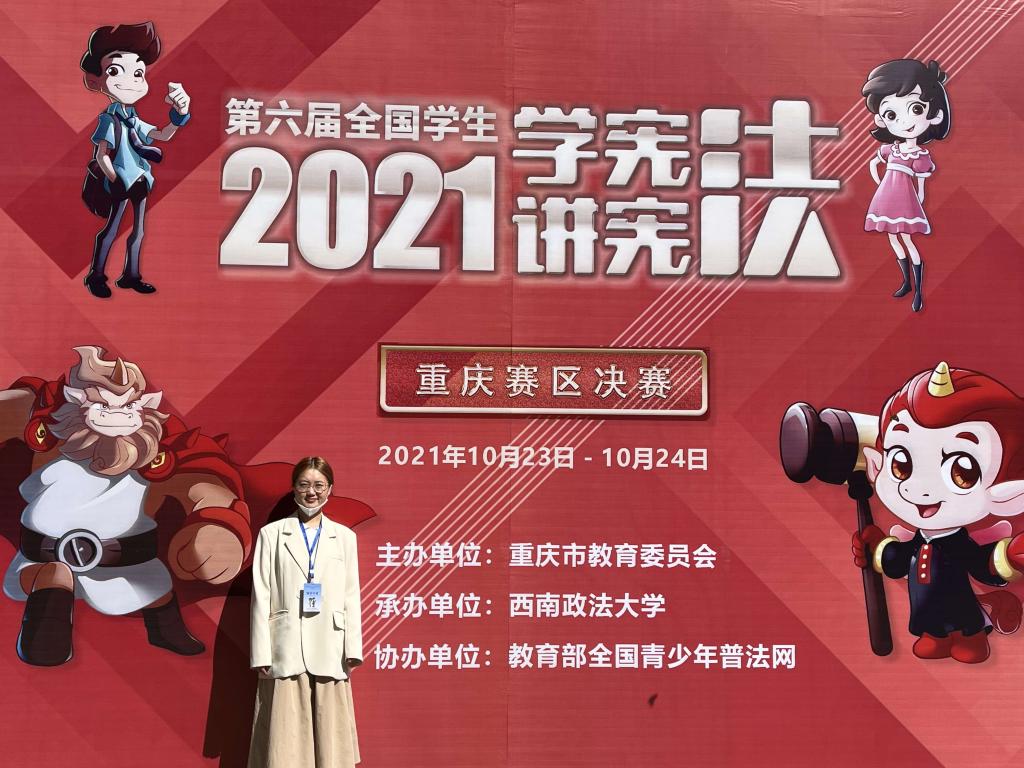 近日,重庆市教委公布了《关于第六届全国大学生“学宪法 讲宪法”活动重庆市决赛获奖情况的通报》,我校国际法学与社会学院学生宁浩彤在衡爱民老师的指导下荣获全市高校组(专业类)知识竞赛组二等奖,国际法学与社会学院陈功书记带领团队获得全市团体奖(高校)三等奖。