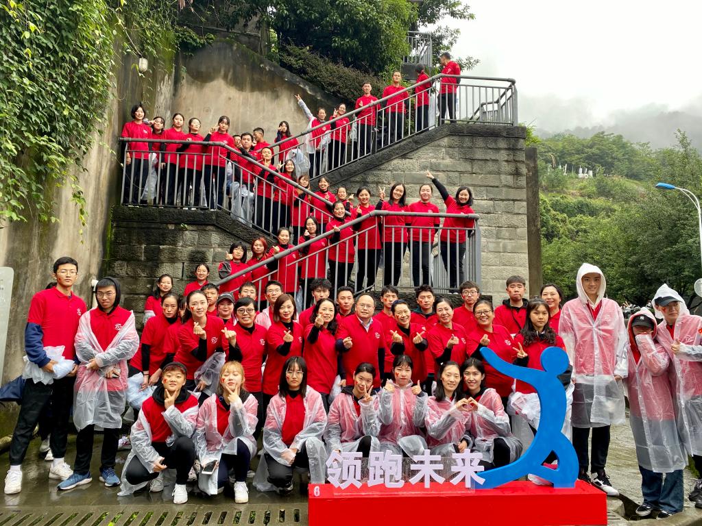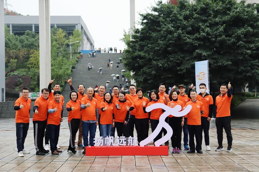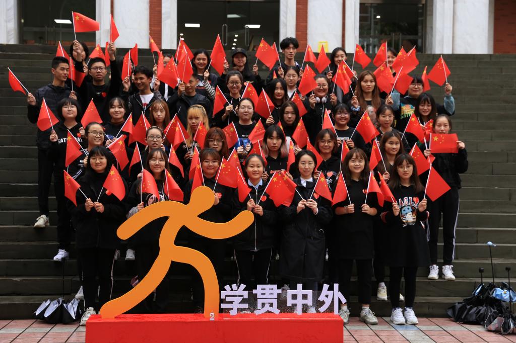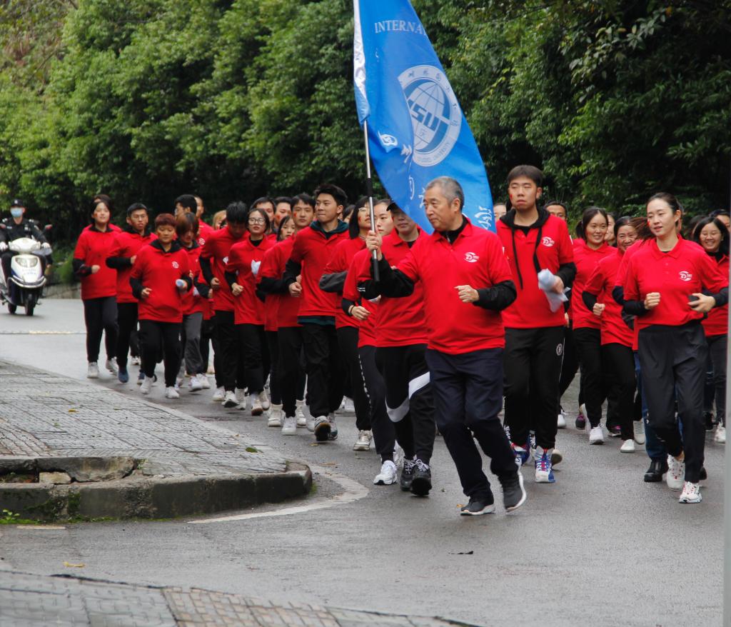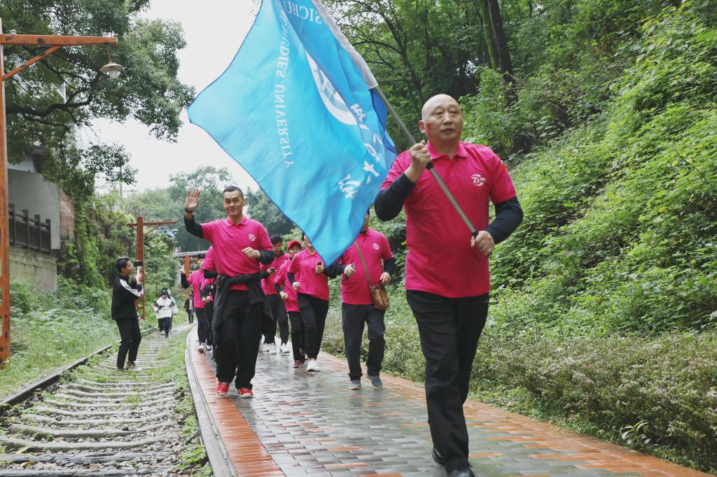 川外70年发展历史,历经7个不同的历史时期。本次活动设置身着不同颜色T恤的7个方队和7段路程,每个方队由1名旗手举校旗领跑,从东区1号门至西区运动场,一路向上,展示了川外人昂扬奋进的斗志。