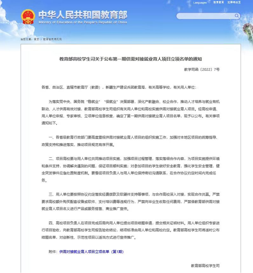 2022年4月6日,教育部高校学生司公布第一期供需对接就业育人项目立项名单,由商务英语学院学工团队申报的与阿里巴巴(中国)网络技术有限公司共建的就业实习基地项目正式获批立项。