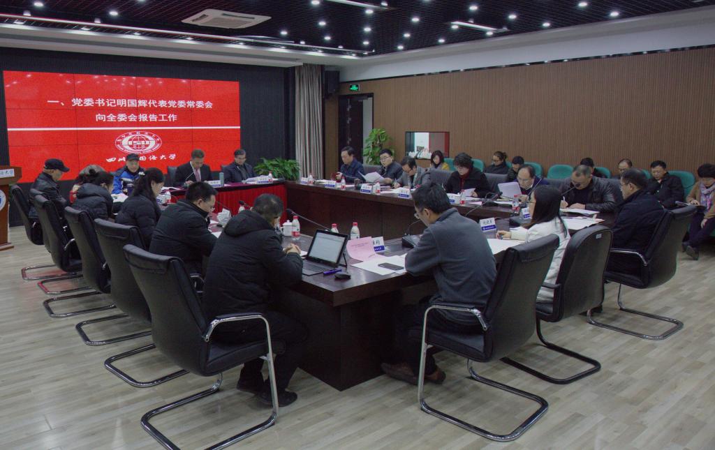 党委书记明国辉代表党委常委会向全委会报告工作。他回顾了第一次党代会以来学校党建和事业发展取得的成效,并与参会人员共同探讨学校2018年的重点工作及今后几年全面推进从严治党和党委引领深化改革等方向性问题。报告指出,第一次党代会以来,学校把政治建设摆在首位,全面加强和改进党的建设和思想政治工作,各项事业取得新进展。2018年,学校要深入学习宣传贯彻党的十九大精神和习近平新时代中国特色社会主义思想,全面推进从严治党,全面落实新时代党的建设总要求,加强党的建设和思想政治工作的系统谋划和部署。坚持党委引领深化改革,以应用研究型大学建设为导向,实施应用型和研究型两条腿走路,扎实打牢人才培养的基石。始终坚持以学科发展为龙头,大力加强师资队伍建设,强化内部治理体系建设。报告指出,此次全会根据形势与政策的变化对学校第一次党代会和十三五规划确定的发展定位和目标作了调整,即由教学研究型转变为应用研究型。“应用研究型”中的“应用”与“研究”是并列的关系,是相互支撑和相互依存的,“两条腿走路”和“顶天立地”两种不同的表述,表达了相同的含义,即在推进外国语言文学学科发展的基础上,着力加强适应国家和地方经济社会发展需求的人才培养与研究平台建设。报告认为,在学校下一步的内涵发展及“双一流”建设方面,我们要寻求差异化发展路径,发挥相对比较优势,以开放、包容的姿态拥抱“应用研究型”发展定位,推动学校内涵式发展。