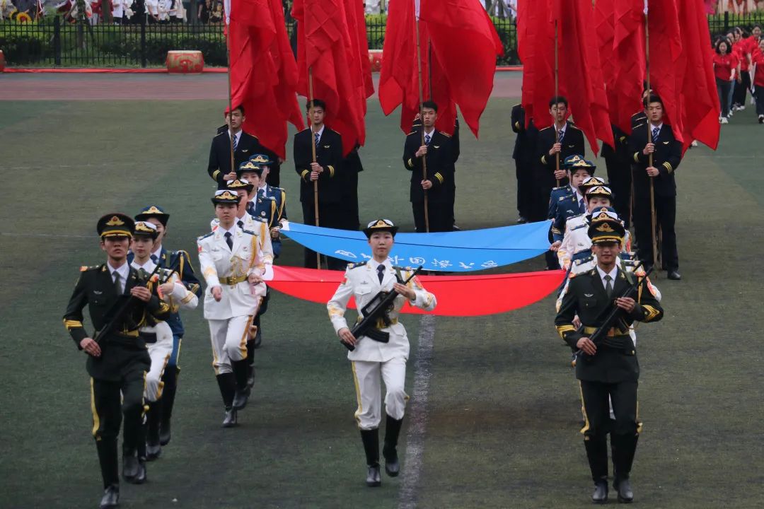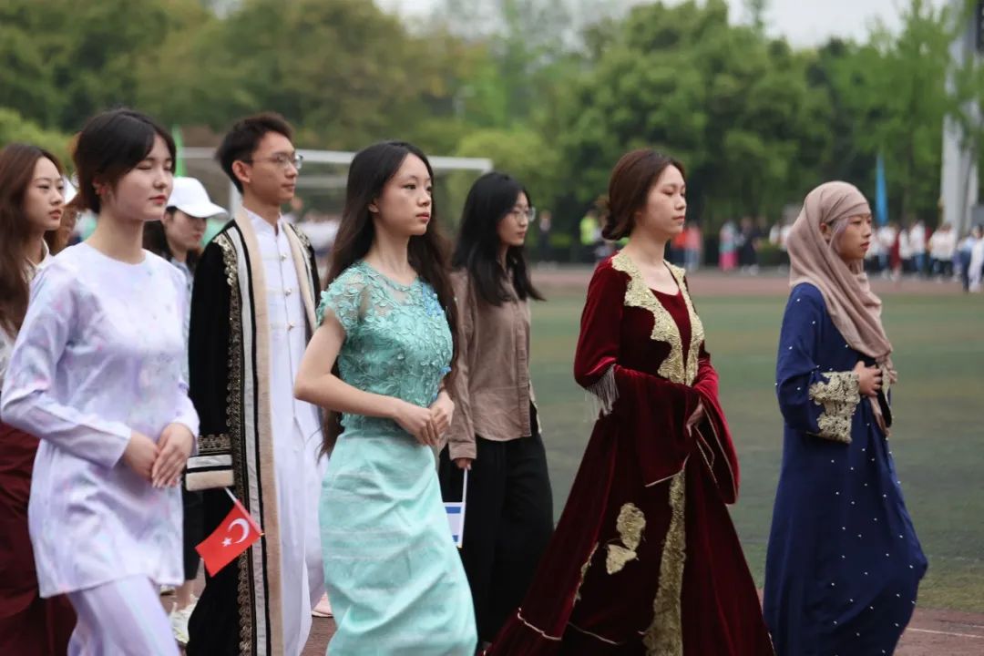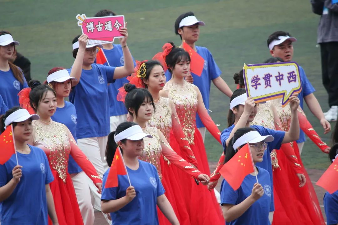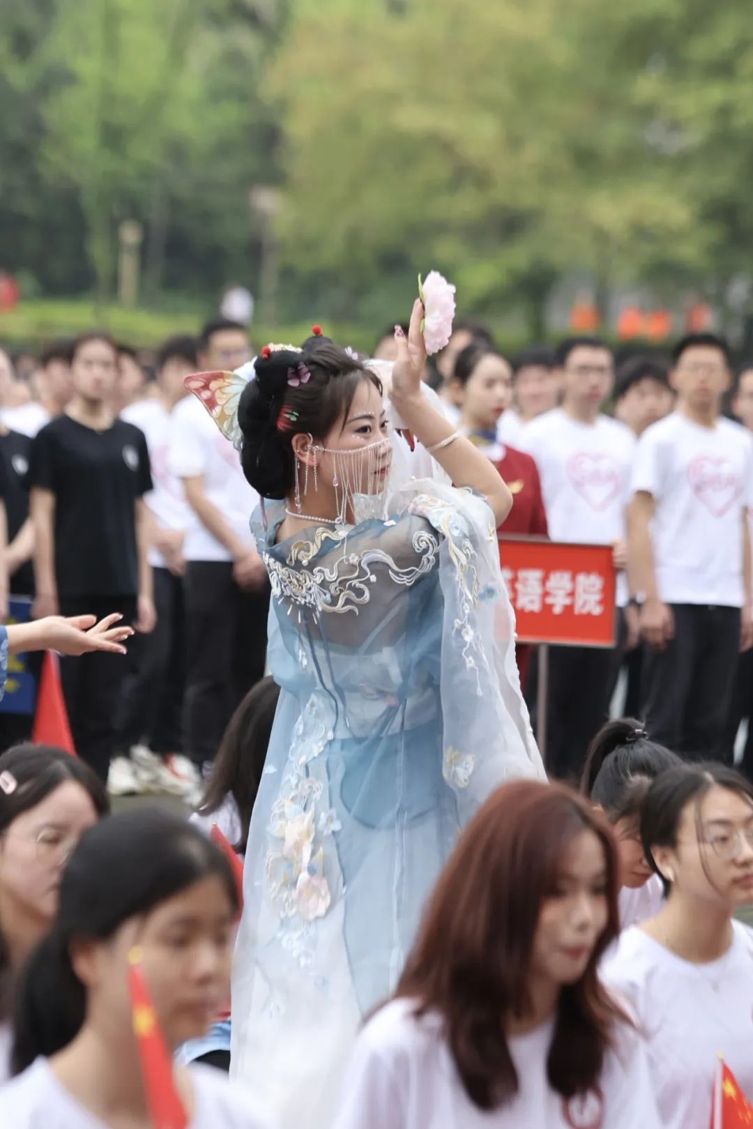 上午8时许,国旗护卫队迈着庄严而整齐的步伐入场,拉开了此次开幕式的序幕。随后各院系教师及学生方队依次入场,东方语言文化学院身着阿拉伯、朝鲜、越南等国家特色服饰,展现了各国家之美;中国语言文化学院身着各朝汉服,随音乐翩翩起舞;国际工商管理学院带来军体拳表演,展示少年们的意气风发……