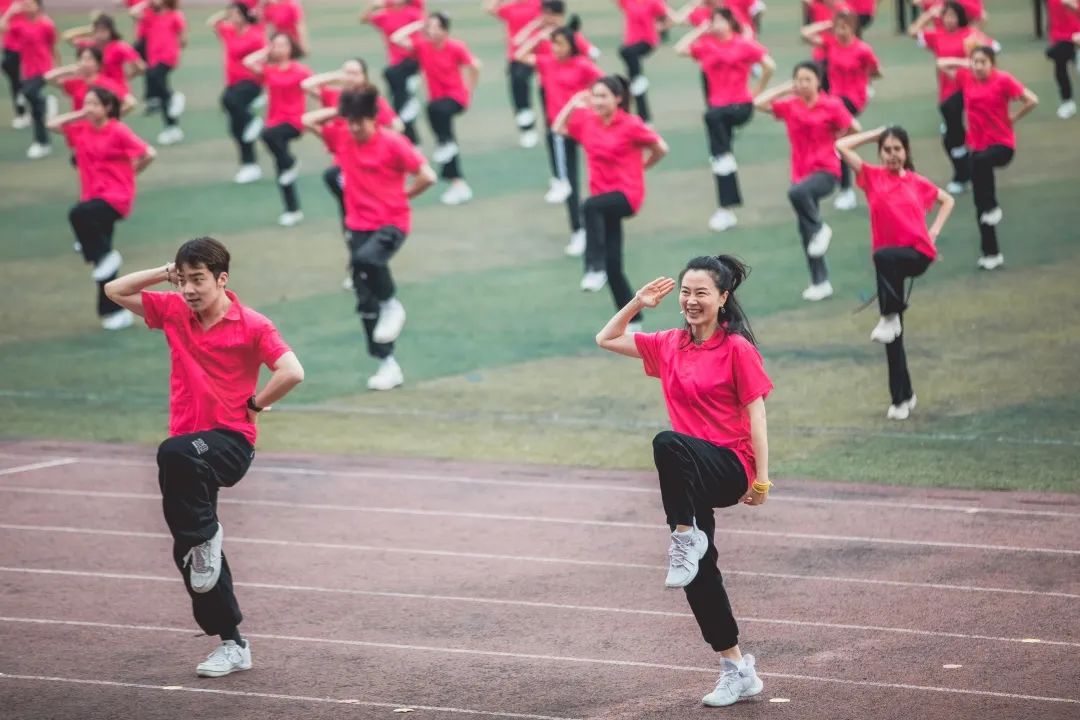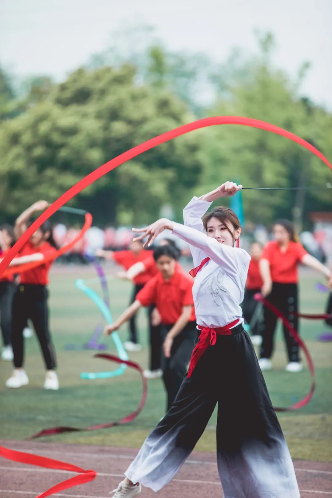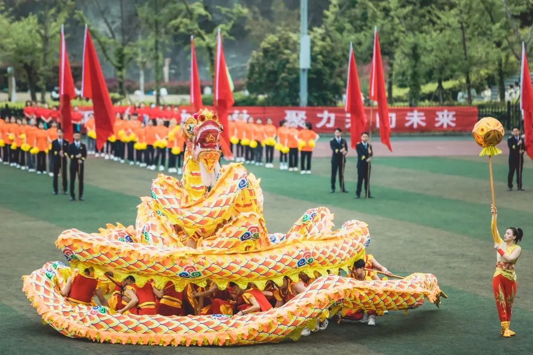 开幕式表演中,铜梁“高楼火龙团队”带来的竞技龙表演首先登场。红黄交织的“铜梁龙”在气势磅礴的音乐声中飞舞盘旋,时而交错盘绕,时而腾云驾雾,师生们有幸领略了这一“中华第一龙”的英姿,现场欢呼声、呐喊声不断。体育选项课展示环节,师生们的飒爽英姿将开幕式气氛推向高潮:啦啦队队员们手捧花球,朝气蓬勃的姿态展现出青年学子的阳光与活力;排球队、篮球队、足球队和网球队运动员们的表演动作整齐划一,刚劲有力,释放青春蓬勃的魅力;在《万疆》的优美歌声中,艺术体操方阵亮相,彩带在师生们手中肆意舞动飞扬,柔美中迸发力量;轮滑社、轮滑班的学生们创意满满,自主编排轮滑舞将运动美与舞蹈美融为一体,用舞蹈绽放风采;跟随着音乐的动感节拍,由260人方阵带来的原创排舞表演《你要跳舞吗》充满律动和青春活力,现场叫好不断;由国际教育学院大学生艺术团、体育部篮球课程班带来的《踏鼓寻春》展现的舞姿时而轻盈欢快,时而庄严虔诚。少年郎意气风发奏响鼓乐,少女们身姿绰约剑舞乾坤,共同敬颂春神与水神。