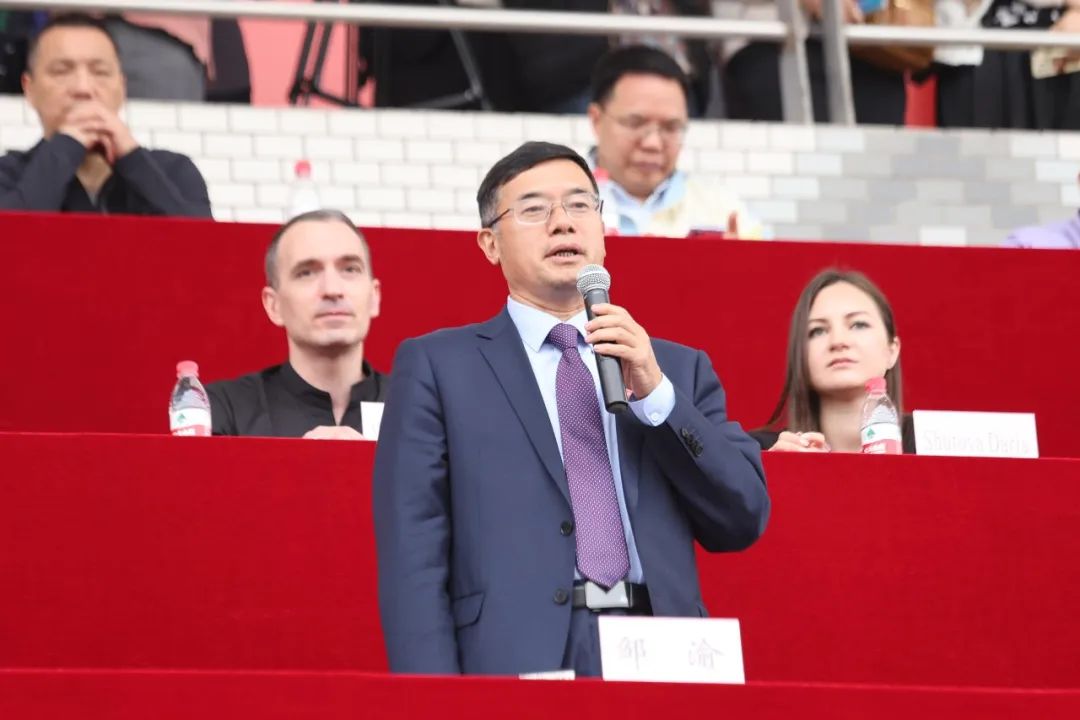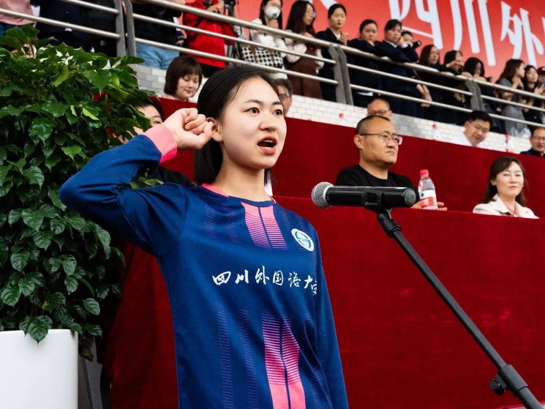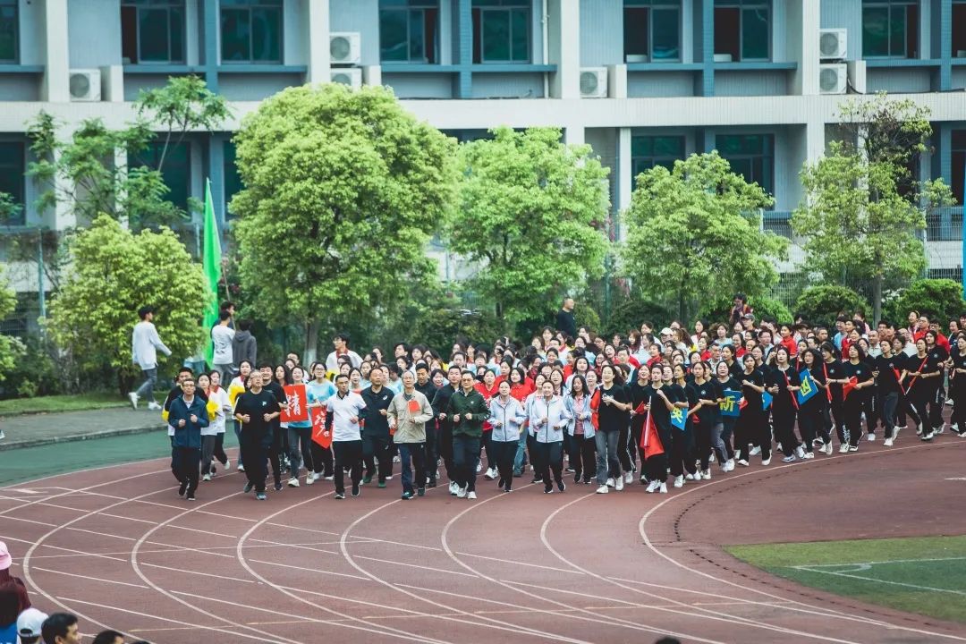 邹渝宣布四川外国语大学2023年春季运动会正式开幕。枪声响起,全体师生绕运动场奔跑一圈,开启了春季健康跑活动。