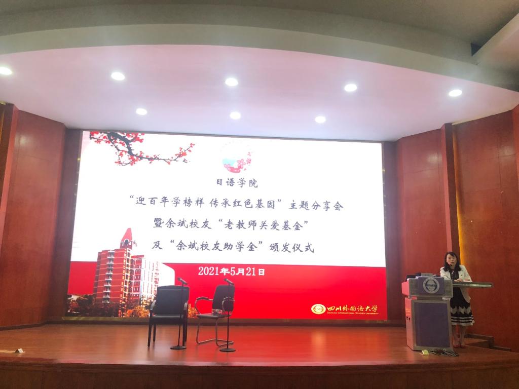 5月21日14:30,日语学院“迎百年学榜样,传承红色基因”主题分享会暨余斌校友“老教师关爱基金”及“余斌校友助学金”颁发仪式在培英楼放映厅举行。