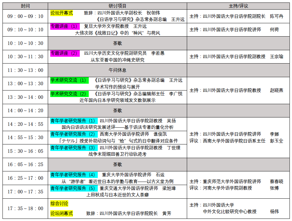 《日语学习与研究》杂志常务副总编、复旦大学外文学院教授王升远、编辑部主任李广悦、四川大学历史文化学院副研究员李若愚、四川外国语大学日语学院院长黄芳、副院长陈可冉、我校日语专业博士生导师杨伟,以及来自河南大学、西南大学、重庆大学、重庆师范大学、重庆交通大学、重庆文理学院等高校日语及相邻专业的师生,共40余人全程参加了本次学术活动。四川外国语大学党委常委、副校长祝朝伟亲临会场,为论坛致开幕词。