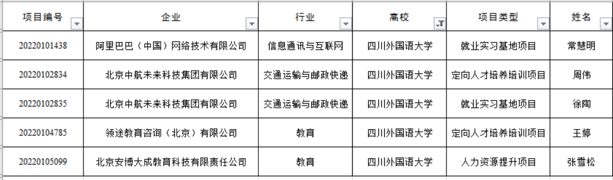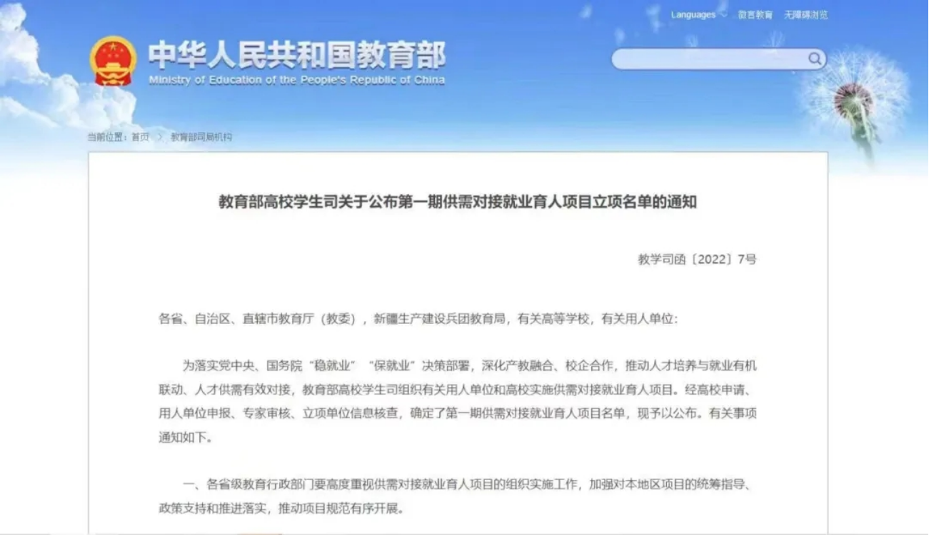 2022年4月6日,教育部高校学生司发布通知《关于公布第一期供需对接就业育人项目立项名单的通知》(教学司函〔2022〕7号),我校教务处、招生就业处、国际工商管理学院、商务英语学院申报的五个项目入选供需对接就业育人项目立项名单,对接单位有阿里巴巴(中国)网络技术有限公司、北京中航未来科技集团有限公司、领途教育咨询(北京)有限公司、北京安博大成教育科技有限责任公司等四家优质企业,项目合作内容包括定向人才培养培训、就业实习基地和人力资源提升三种形式。