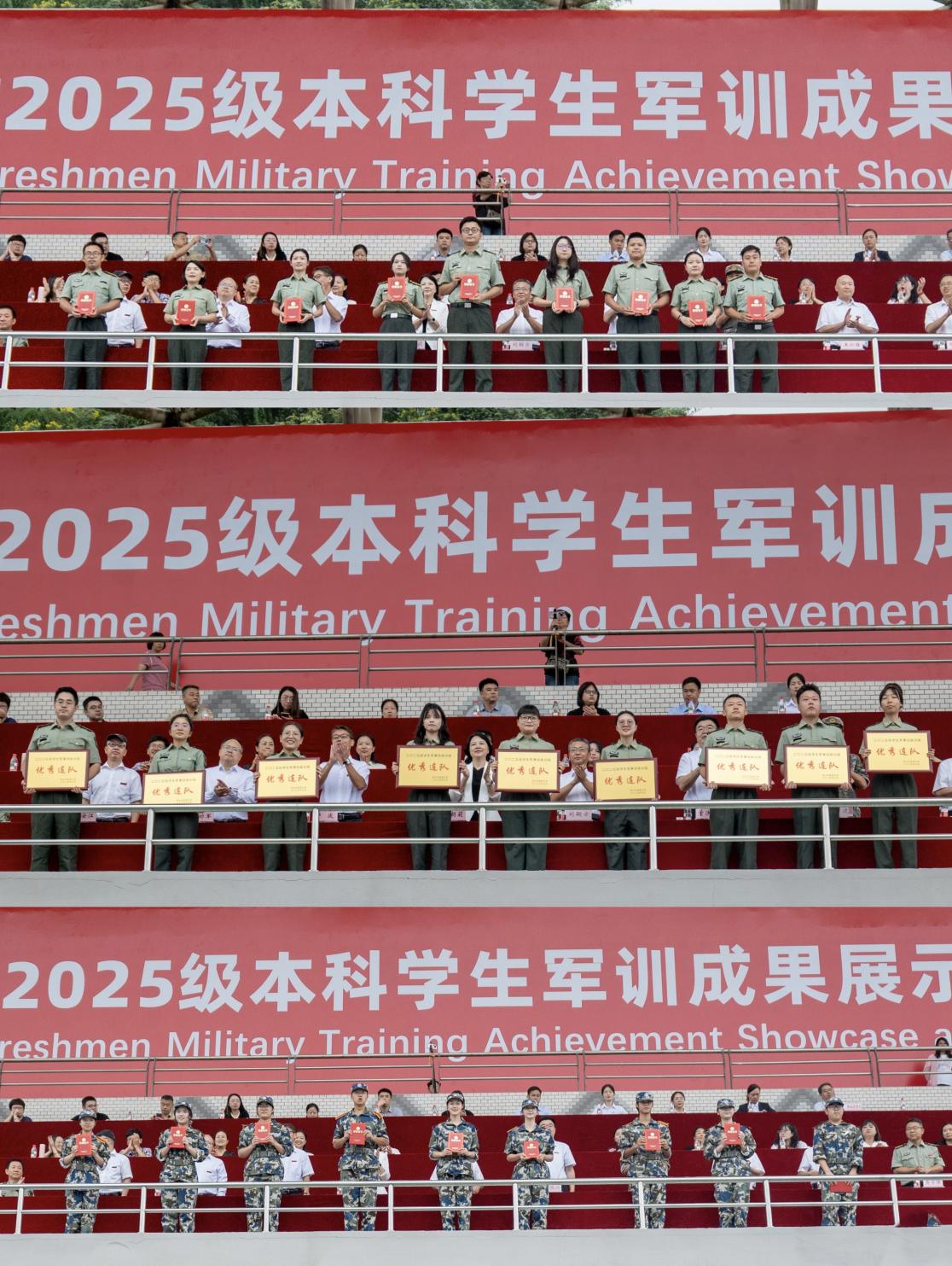 汇报表演结束后,副校长卢波宣读《四川外国语大学关于表彰2025级新生军训先进集体和先进个人的决定》,表彰了410名“优秀学员”、16个“先进连队”、18名“优秀辅导员”及7位“优秀工作者”。校领导与承训部队领导为受表彰的集体及个人授奖。